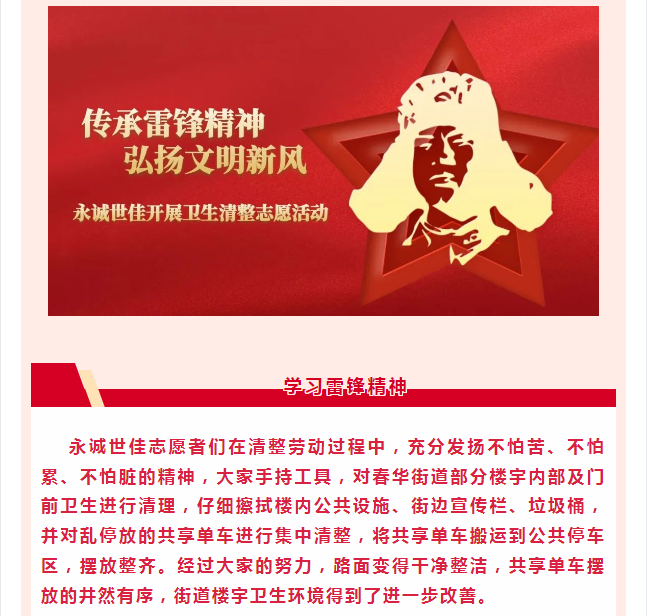 永誠(chéng)世佳開(kāi)展“傳承雷鋒精神 弘揚(yáng)文明新風(fēng)”衛(wèi)生清整志愿活動(dòng)